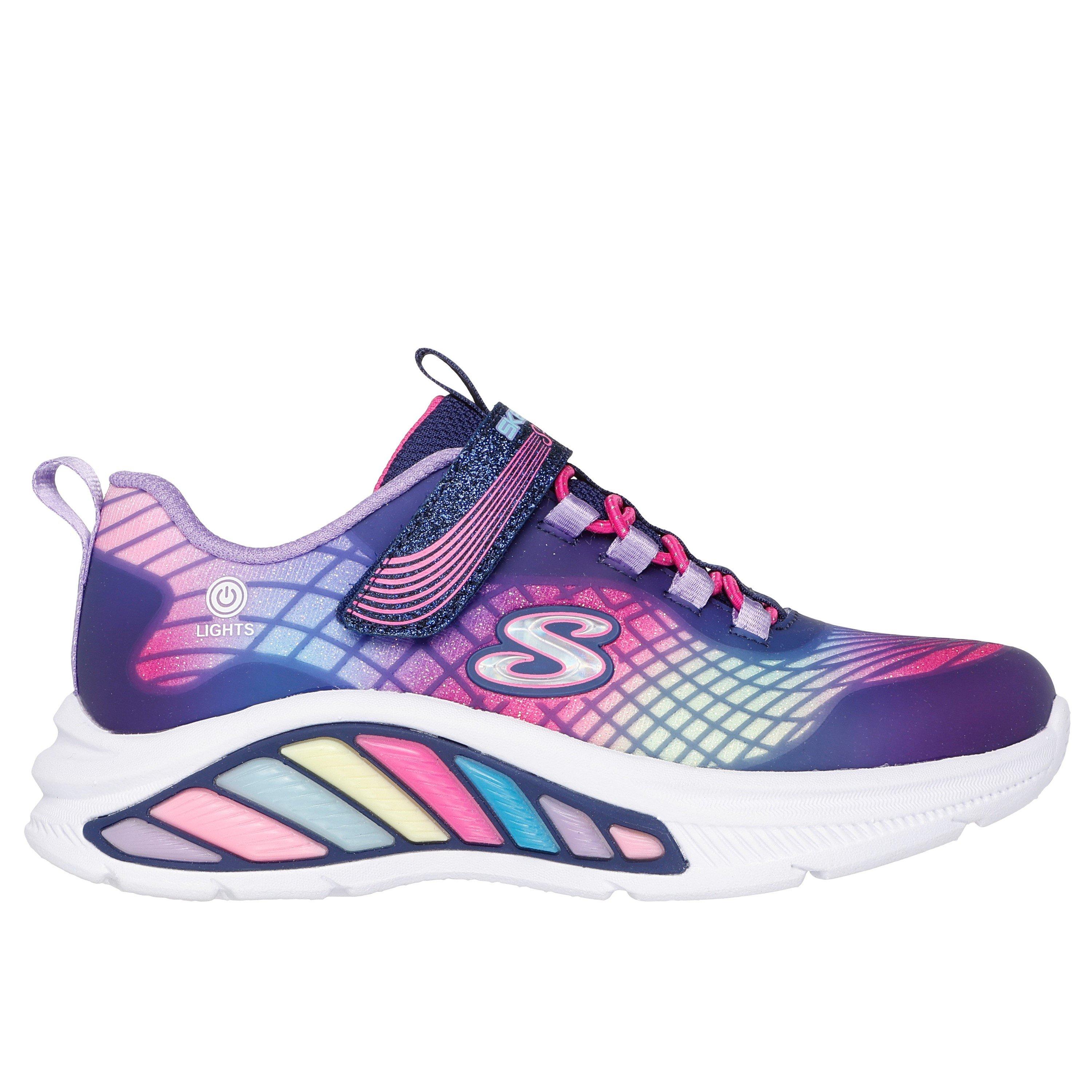 Le sneakers Skechers' Kids' Rainbow Light Up presentano una tecnologia di illuminazione integrata con una costruzione durevole. Il design ispirato all'arcobaleno presenta un'illuminazione attivata dal movimento che accentua il movimento con un leggero bagliore durante le attività atletiche quotidiane dei bambini, rendendo questa calzatura illuminata ideale per sport e attività di corsa che portano a un gioco attivo.
